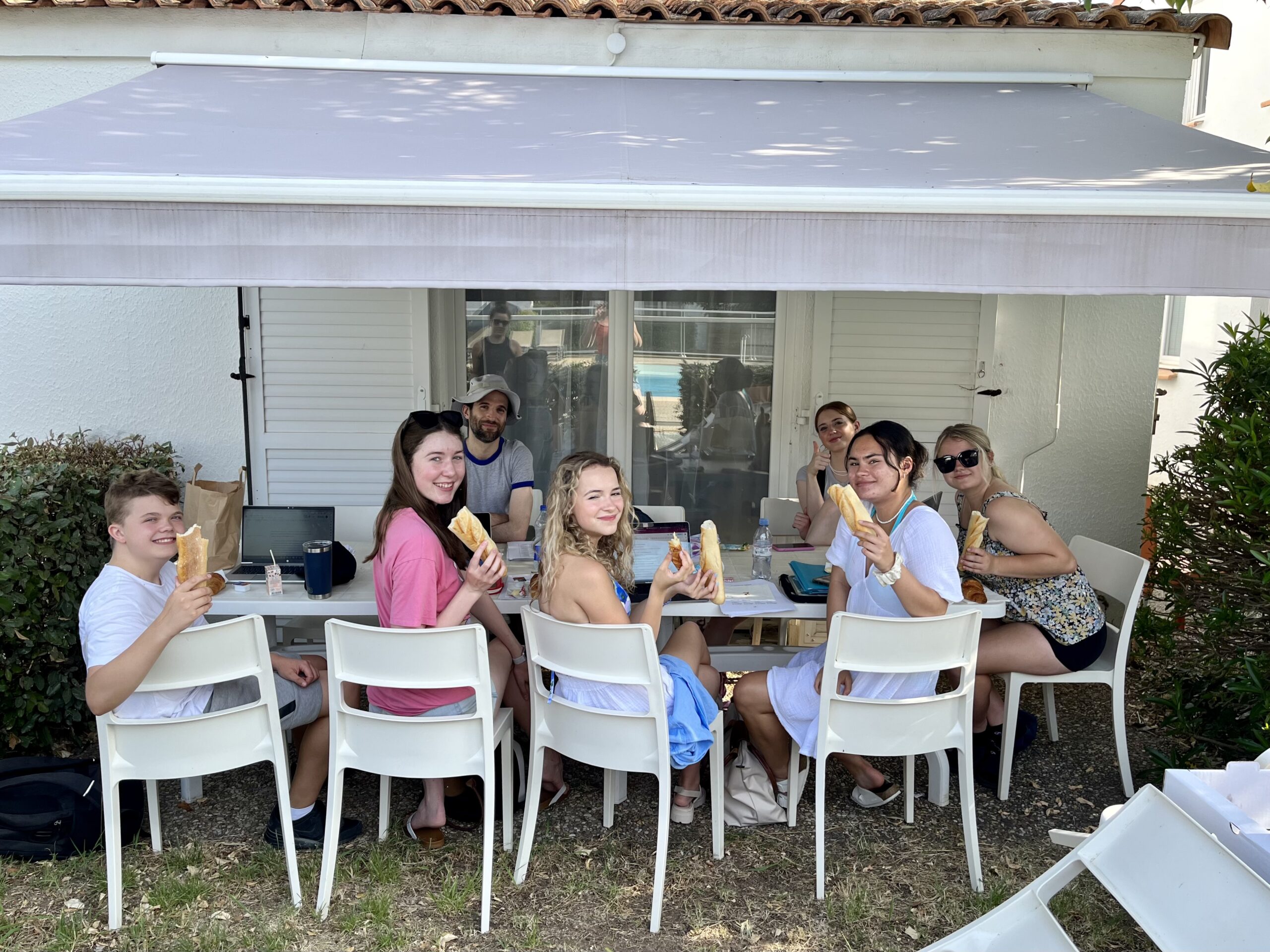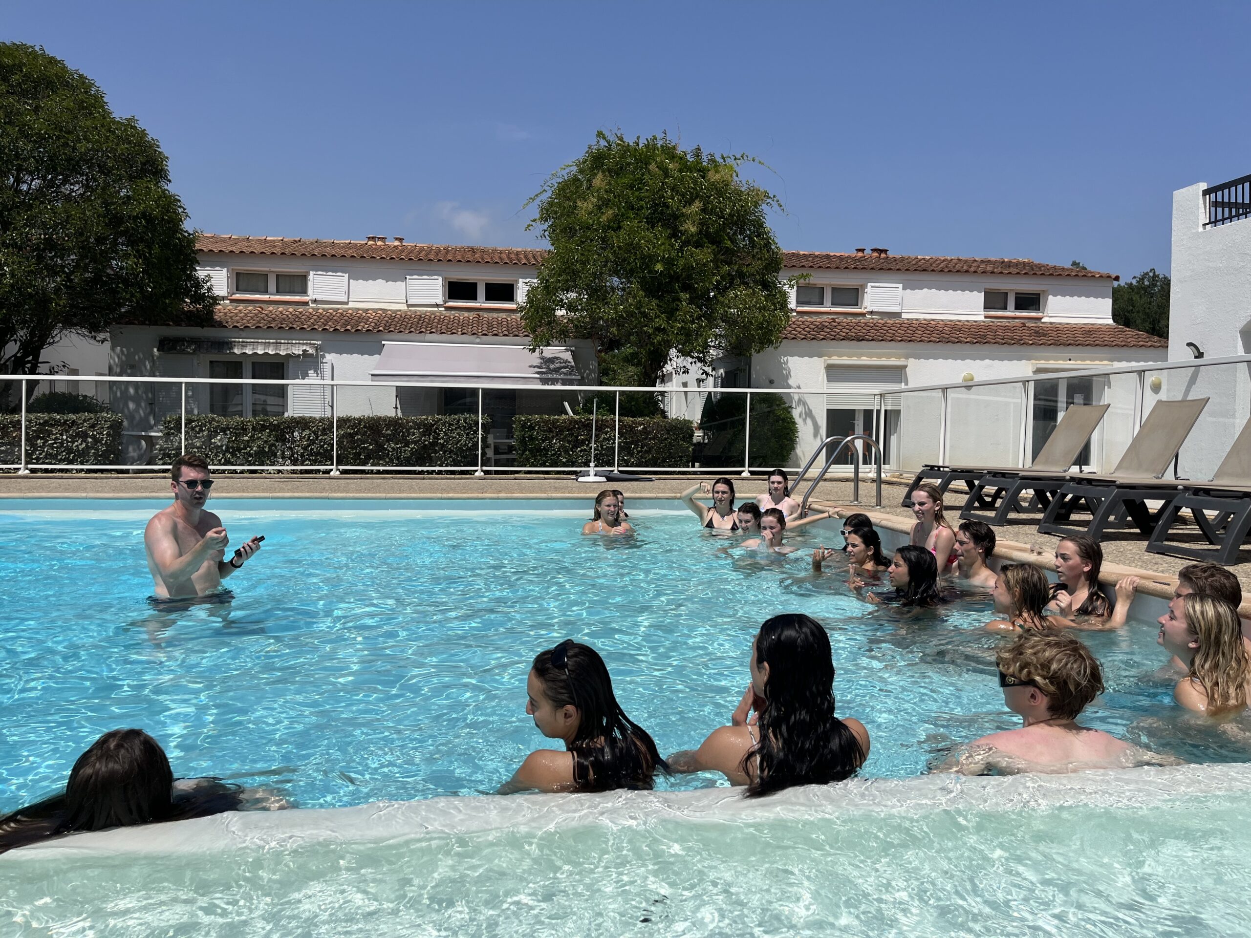 We arrived in Cannes yesterday afternoon after a long day of travel—thankfully, our students are champs and embraced the challenges that come with getting a big group on and off a high-speed French train. Upon our arrival in Cannes, we were picked up and taken to our hotel in Mandelieu, tucked (quite literally) in the mountains, about 10 minutes from both town and the beach. So far, everyone is loving Mandelieu—the students made quick use of our hotel’s amenities, like the pool and soccer field, and some of our teachers have even taken to having their classes there. It is hot—we are diligently applying sunscreen and drinking our water. We are looking forward to a great week here, complete with visits to Cannes and Saint-Tropez.
