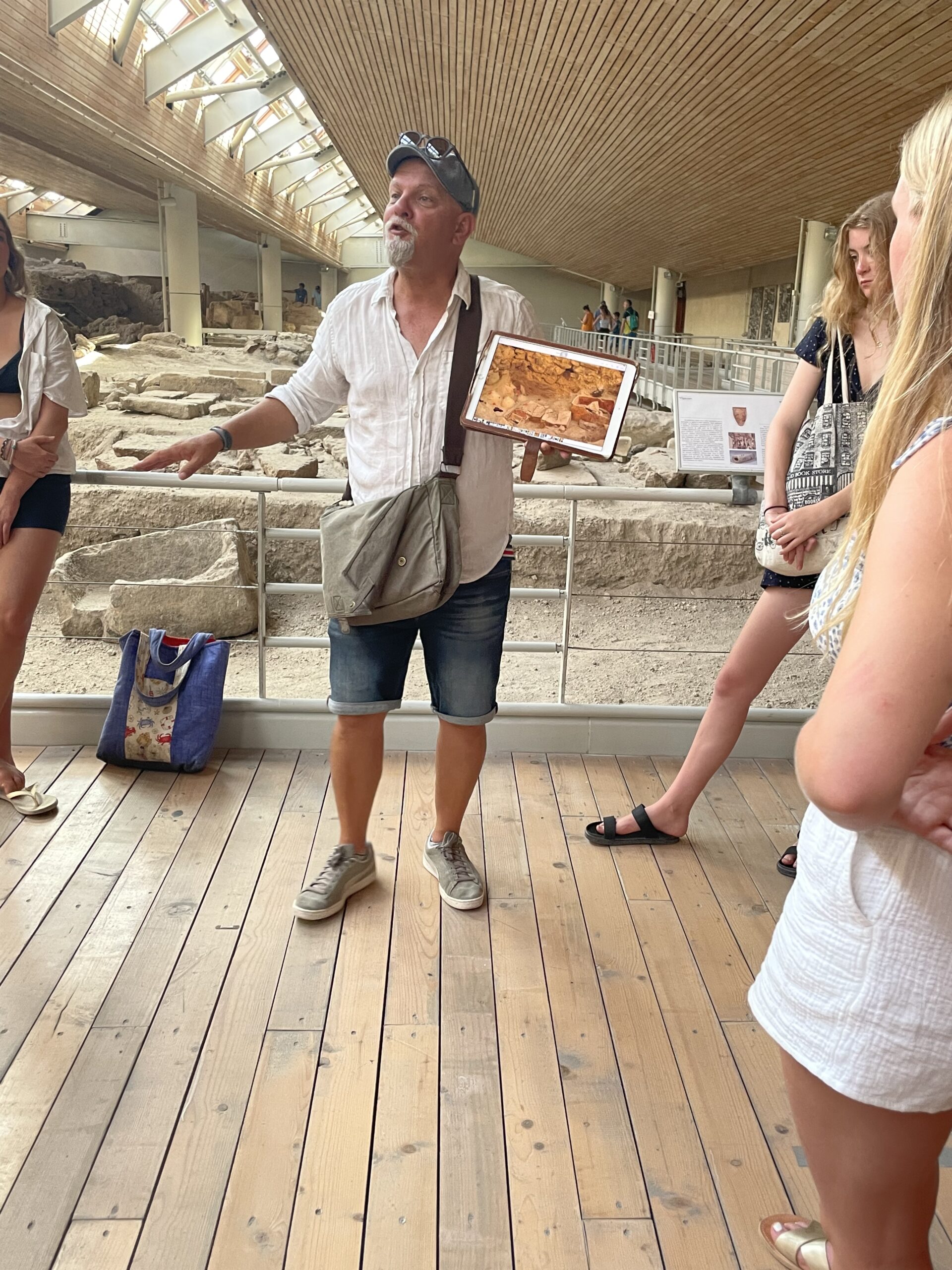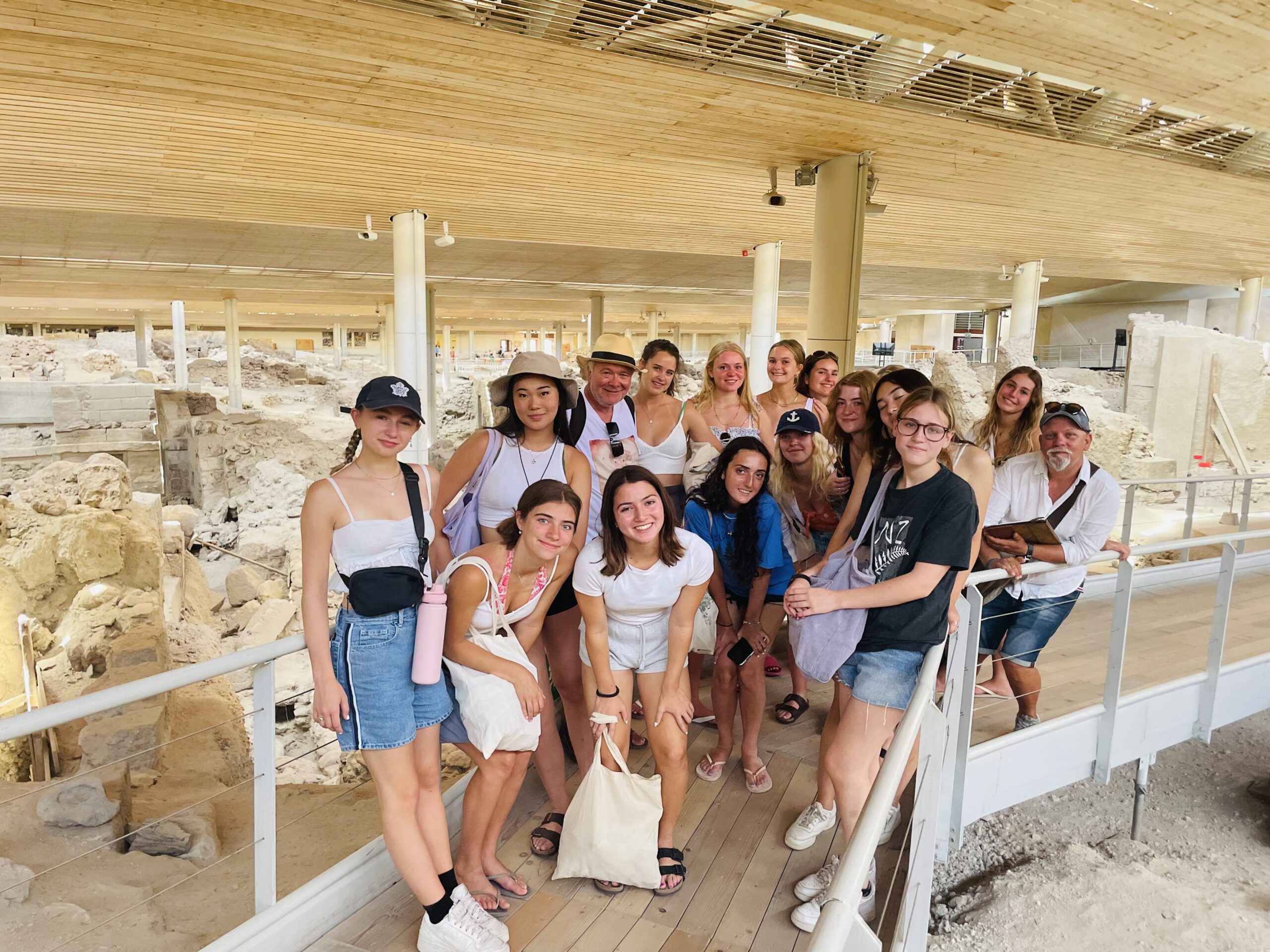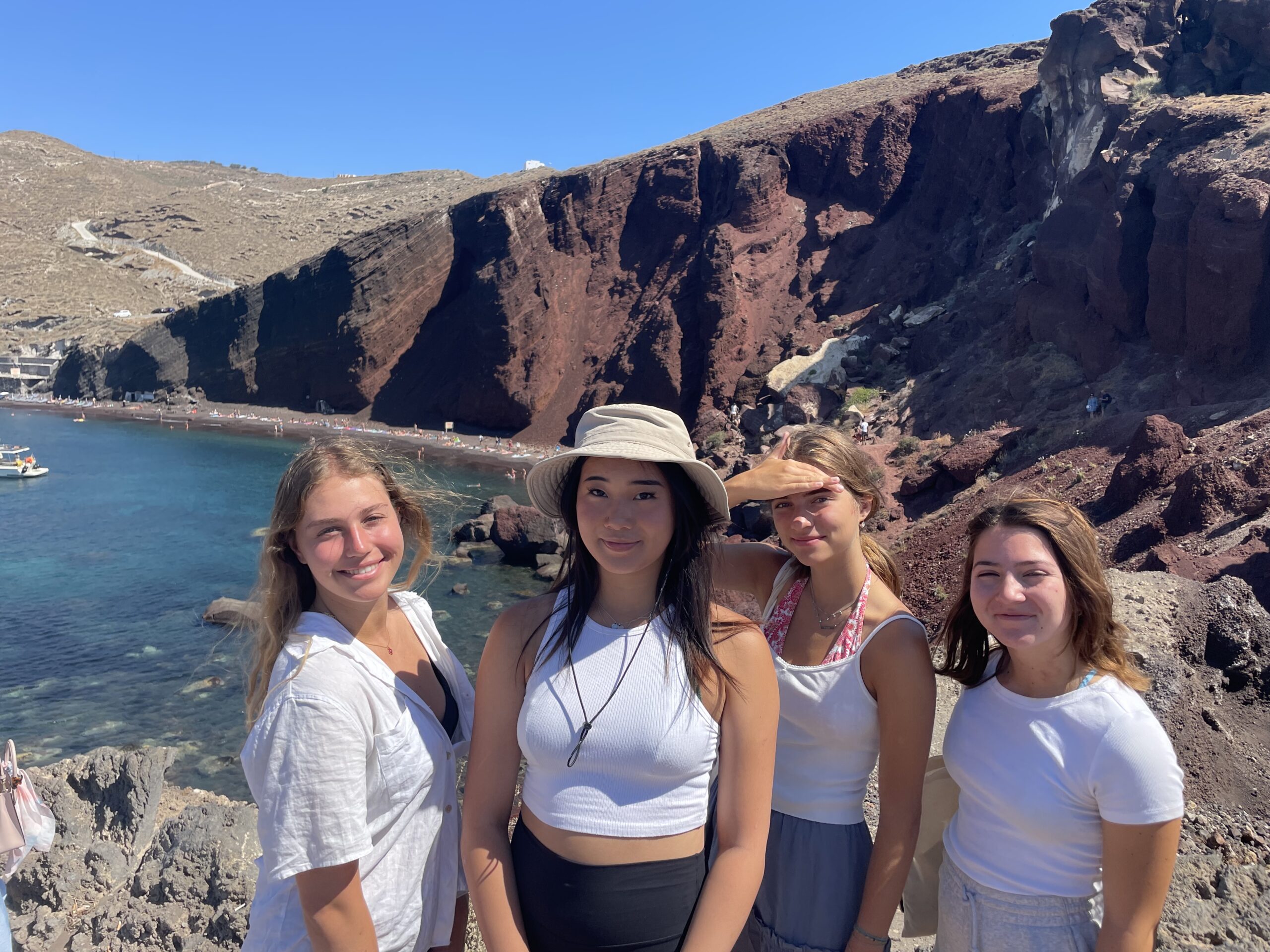 Today we woke up nice and early ready for Monday morning classes. We arranged a special tour for the Classic Civilizations class to visit the ancient site of Akrotiri. Our guide Kosta brought us back to ancient times with his meticulous explanations of the artefacts left behind from what has been excavated at the site. We then had the opportunity to visit the Red Beach where we took some photos and headed to the black sand beach for a swim! The evening dinner was lovely as usual, and students signed out to enjoy their last evening in Santorini. Off to Crete tomorrow!